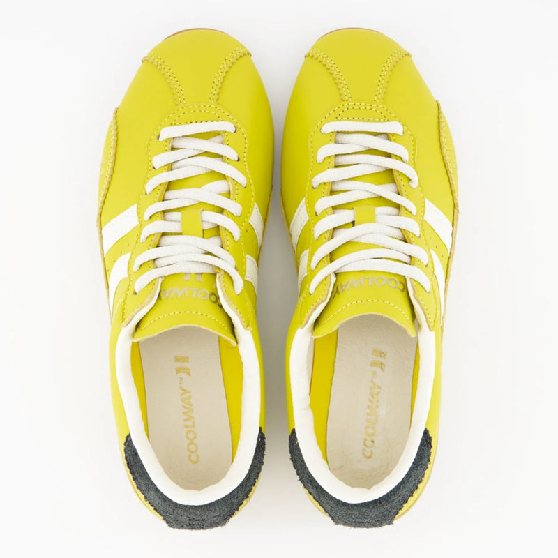 COOLWAY Step Buzz Yellow sneaker with a retro style, crafted mainly from suede. The Step features a tongue with detailed branding, a soft leather padded collar, and double laces that can be swapped for a personalized look. On the sides, you'll find the brand’s iconic DUAL logo. The insole includes a gel bubble that provides exceptional comfort during wear.