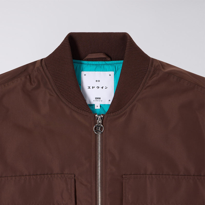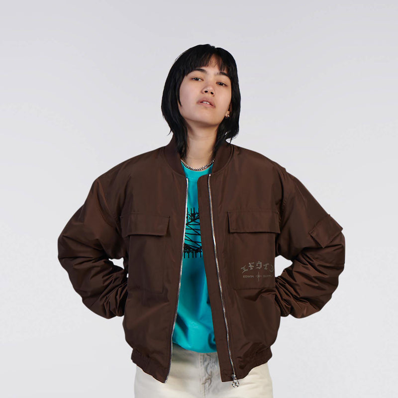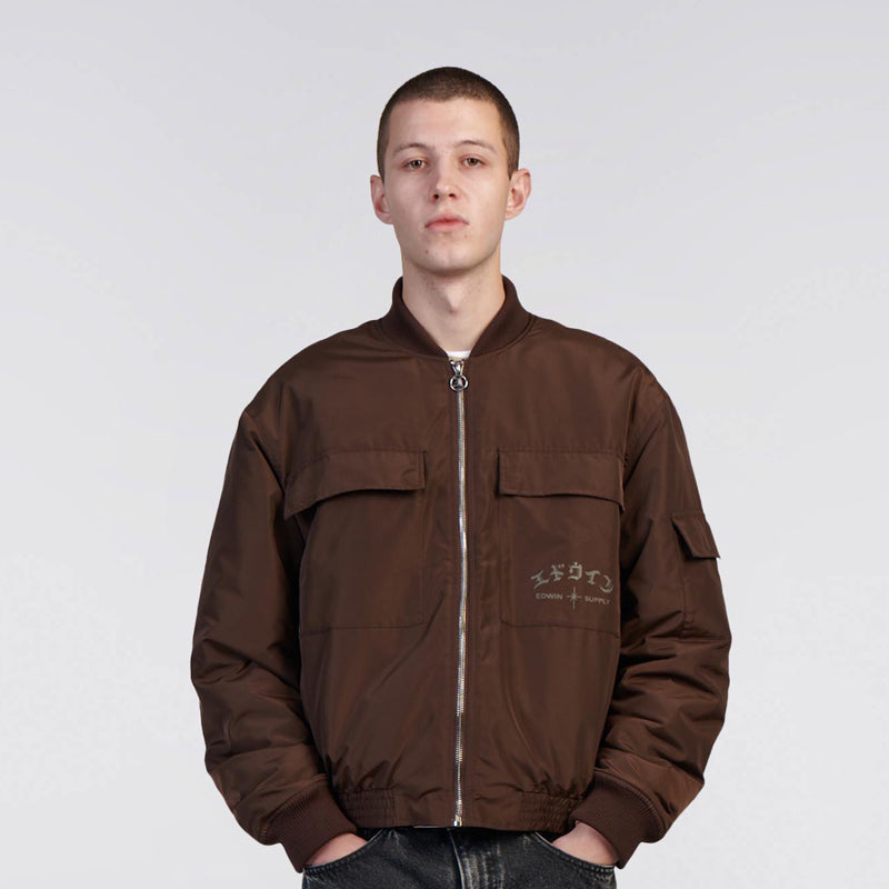 The Edwin Ultra Bomber Jacket is a boxy-fit bomber jacket designed with a technical edge. It features padded quilting, a metal front zipper, multiple snap and zip pockets, and ribbed collar and hem. On the front pocket, there is a printed “Edwin” logo, adding a signature detail.