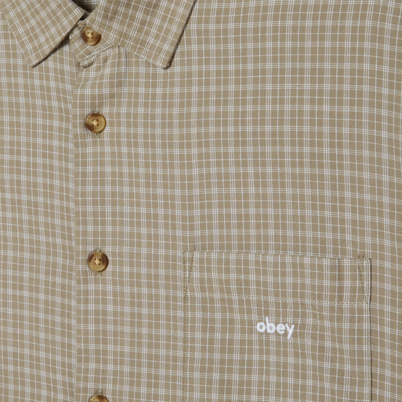Obey Bigwig Ian Woven Shirt unbrushed flannel short sleeve shirt with a button front closure and loose fit. Features a chest pocket with OBEY embroidery and scallop hem.
