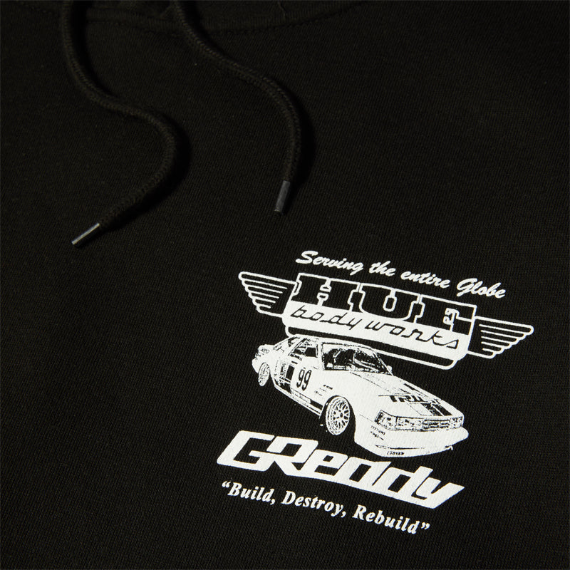 Το HUF x GReddy Body Works P/O Hoodie είναι μία συνεργασία μεταξύ της HUF και της GReddy, εμπνευσμένη από τον κόσμο του drift και της αυτοκινητιστικής κουλτούρας. Διαθέτει στάνταρ γραμμή, hood με κορδόνια ρύθμισης και μεγάλο καγκουρό τσέπη.
